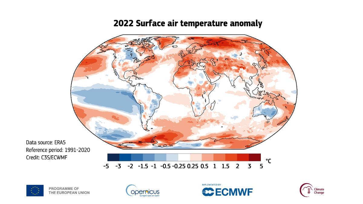 Innanzi tutto, è vero che c’è una variabilità naturale del clima che influisce sulle temperature da un anno all’altro, ma è anche vero che se facciamo medie decennali, negli ultimi 60 anni ogni decennio è stato sempre più caldo di quello precedente. Gli ultimi otto anni, poi, sono stati i più caldi di tutto il periodo che va dal 1850 a oggi. C’è un influsso antropico che pilota una tendenza all’aumento delle temperature globali e c’è una variabilità naturale del clima che rende conto delle variazioni da un anno all’altro. Guardando al planisfero di Copernicus, che mostra per ogni zona del globo le differenze della temperatura del 2022 rispetto alla media del trentennio 1991-2020, si capisce cosa è accaduto lo scorso anno: i colori rosa e rosso mostrano le zone in cui c’è stato un aumento rispetto alla media, le azzurre e blu quelle in cui si è rilevata una diminuzione.