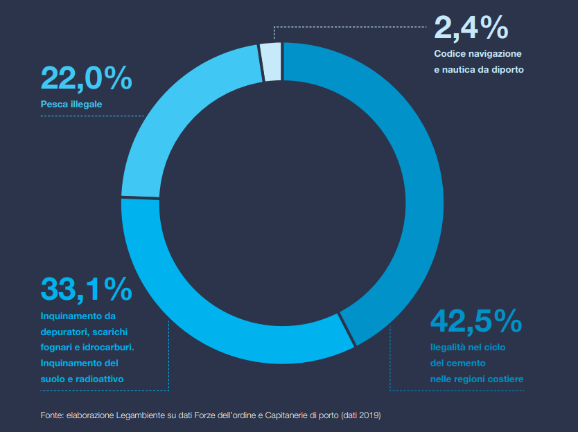 Nel 2019 sono stati 23.623 i reati contestati con 22.564 persone denunciate e arrestate e 6.486 sequestri, per un valore economico che ammonta a circa 520 milioni di euro. Il trend, salvo un calo nel 2016, è da anni in costante aumento. Il 52,3 per cento di tutte le infrazioni contestate si concentra nelle quattro regioni a cosiddetta tradizionale presenza mafiosa. La classifica nazionale per numero assoluto di reati contestati vede al primo posto la Campania, tanto nella classifica del cemento che in quella dell’inquinamento e della navigazione fuorilegge, cedendo il passo solo nella pesca, dov’è seconda dietro la Sicilia. Se si valuta, invece, il numero di reati in rapporto ai chilometri di costa, sale al primo posto la Basilicata, con 10,7 reati per chilometro, seguita dal Molise, con 10,5 reati per chilometro, e, al terzo posto, la Campania con 10.