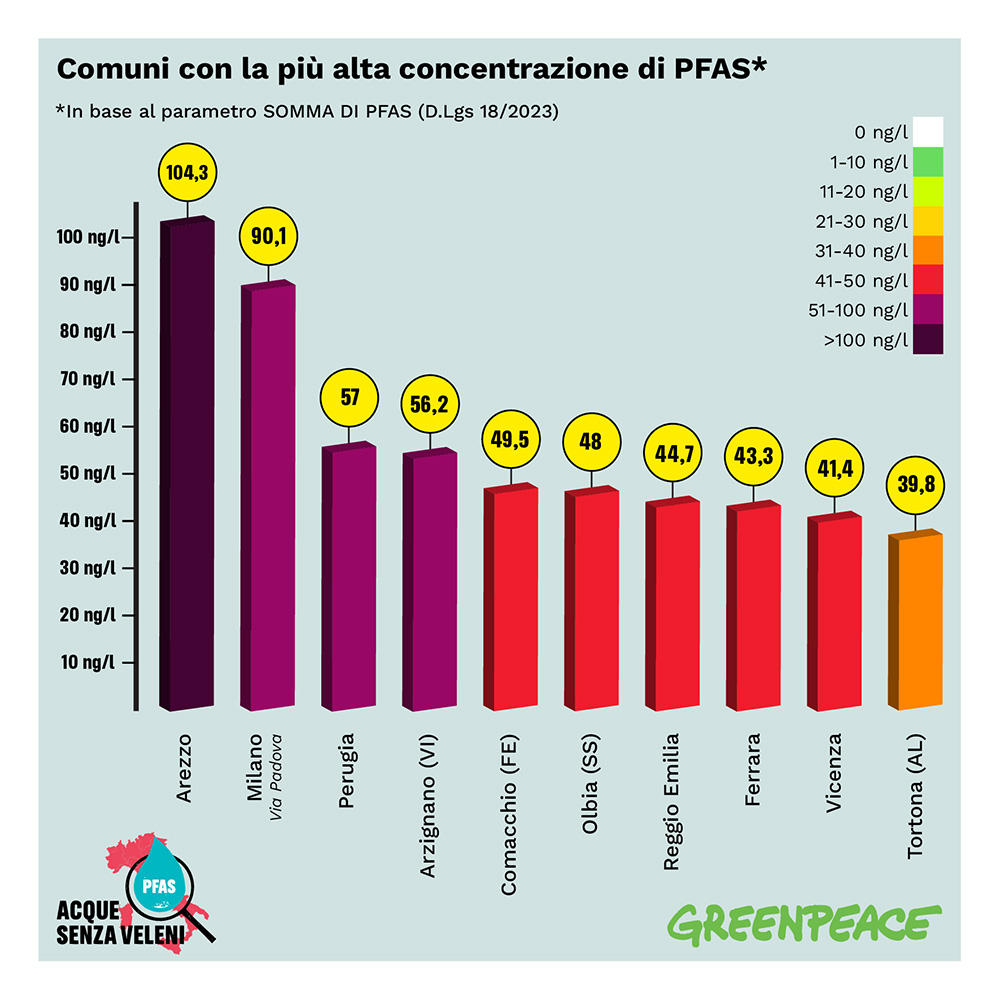 Nell’ambito delle sue analisi indipendenti, Greenpeace Italia ha inoltre verificato la presenza nelle acque potabili italiane dell'acido trifluoroacetico, la molecola del gruppo dei pfas più diffusa sul pianeta, per cui nel nostro Paese non esistono dati pubblici. Il Tfa è una sostanza persistente e indistruttibile ancora oggetto di approfondimenti scientifici che, per le sue stesse caratteristiche, non può essere rimossa mediante i più comuni trattamenti di potabilizzazione.