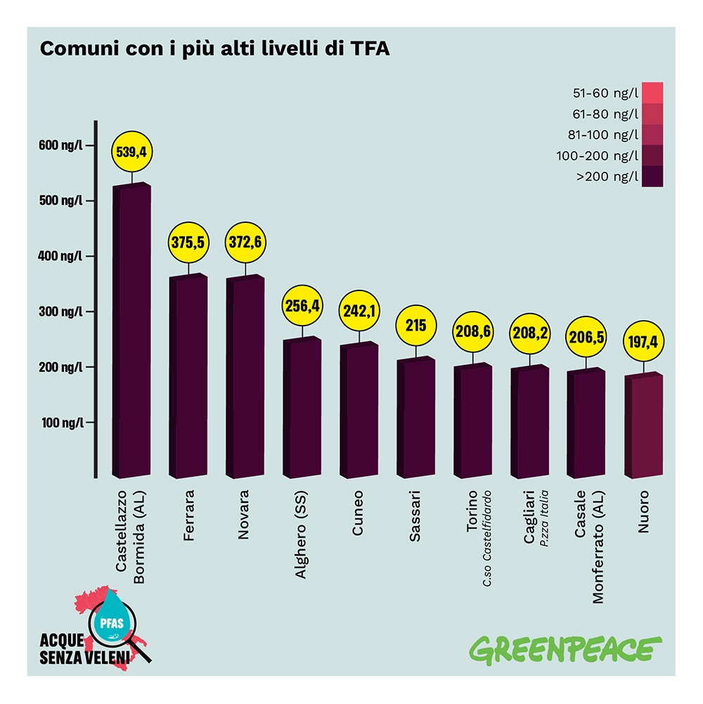 Il comune di Castellazzo Bormida (Al) ha mostrato i valori più elevati (539,4 nanogrammi per litro), seguito da Ferrara (375,5 nanogrammi per litro) e Novara (372,6 nanogrammi per litro). Concentrazioni molto alte si registrano anche ad Alghero (Ss), Cuneo, Sassari, Torino, Cagliari, Casale Monferrato (Al) e Nuoro. La Sardegna (77% dei campioni positivi), il Trentino Alto Adige (75% dei campioni positivi) e il Piemonte (69% dei campioni positivi) sono le regioni in cui la contaminazione da Tfa è risultata essere più diffusa.