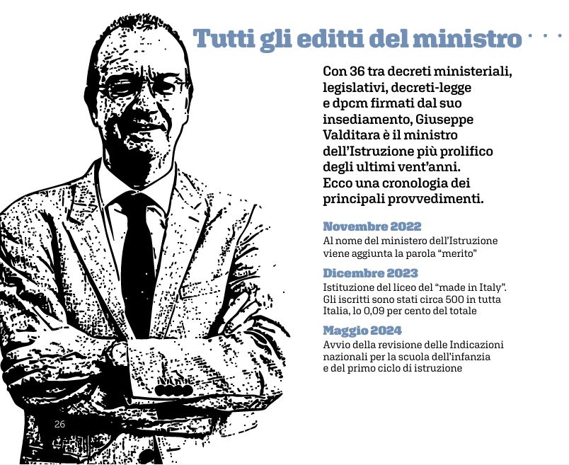 L’atto che introduce le nuove Indicazioni nazionali è l’ultimo di una lunga serie: con 36 decreti governativi firmati dal suo insediamento, uno al mese, Valditara è il ministro dell’Istruzione (e del Merito, stando alla nuova denominazione del dicastero voluta da Giorgia Meloni) più prolifico degli ultimi vent’anni, senza contare le decine di direttive, circolari e note di natura amministrativa. "Per gran parte, si tratta di provvedimenti finalizzati a imbrigliare la critica e il dissenso ed esercitare forme di ingerenza nell’autonomia scolastica e nella libertà di insegnamento e sperimentazione", dice a lavialibera Manuela Calza, segretaria nazionale della Federazione lavoratori della conoscenza (Flc Cgil).