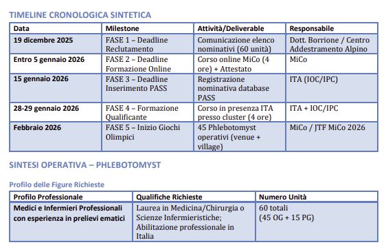 Tra i contenuti della Convenzione, a destare particolare stupore è l’allegato 2 “Timeline formativa volontario phlebotomyst - MiCo 2026”, tradotto nel sottotitolo con “supporto funzione antidoping”. Le premesse sono chiare: servono “risorse sanitarie specializzate” per fare i prelievi “a supporto della funzione antidoping” nei siti di gara e nei villaggi olimpici e paralimpici, oltre che nelle strutture di controllo.