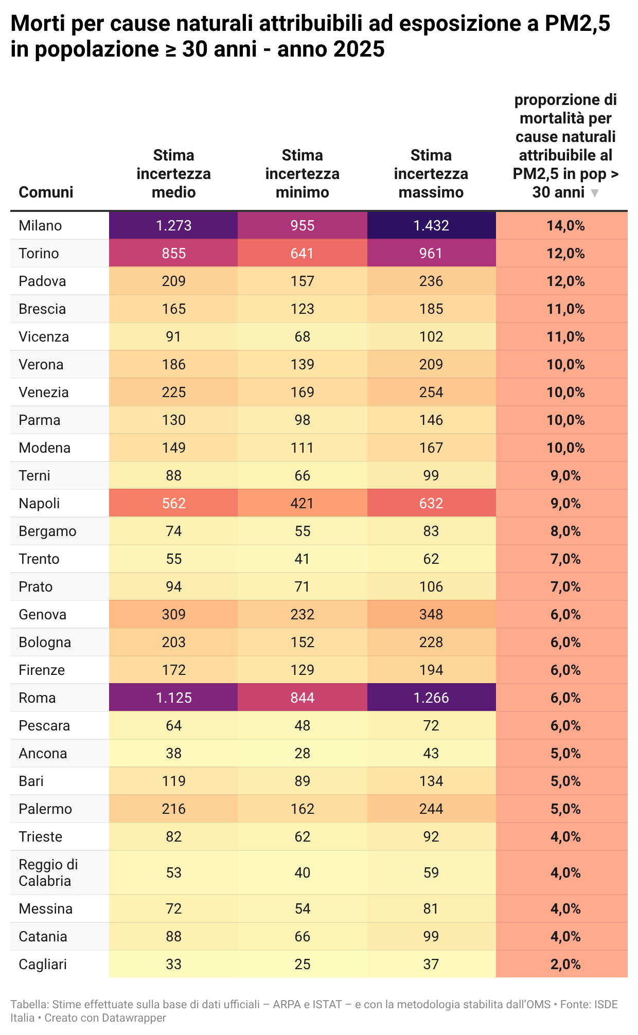 “Il sovraccarico di mortalità – continuano gli esperti – rappresenta l’8 per cento della mortalità per tutte le cause non traumatiche nella popolazione adulta”. Una percentuale molto alta, e in alcune città l’incidenza è ancora maggiore, come a Milano (14 per cento), Torino e Padova (12 per cento), Vicenza e Brescia (11 per cento).