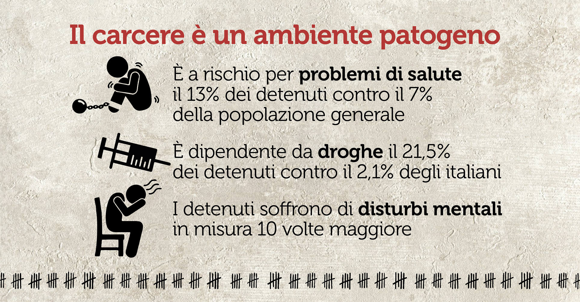 I presidi sanitari presenti negli istituti sarebbero del tutto insufficienti a gestire l’emergenza e i rapporti con le aziende sanitarie locali, cui fa capo la sanità penitenziaria, non sono sempre dei migliori. Per di più in carcere sono reclusi molti anziani e i problemi di salute sono molto più diffusi (13 per cento dei detenuti) che tra la popolazione generale (7 per cento). La sproporzione è evidente soprattutto per la dipendenza da droghe (il 21,5 per cento di chi si trova in carcere è tossicodipendente), l’infezione da Hiv (il 2,08 contro lo 0,2 per cento della popolazione generale) e i disturbi mentali, presenti in misura dieci volte maggiore.
