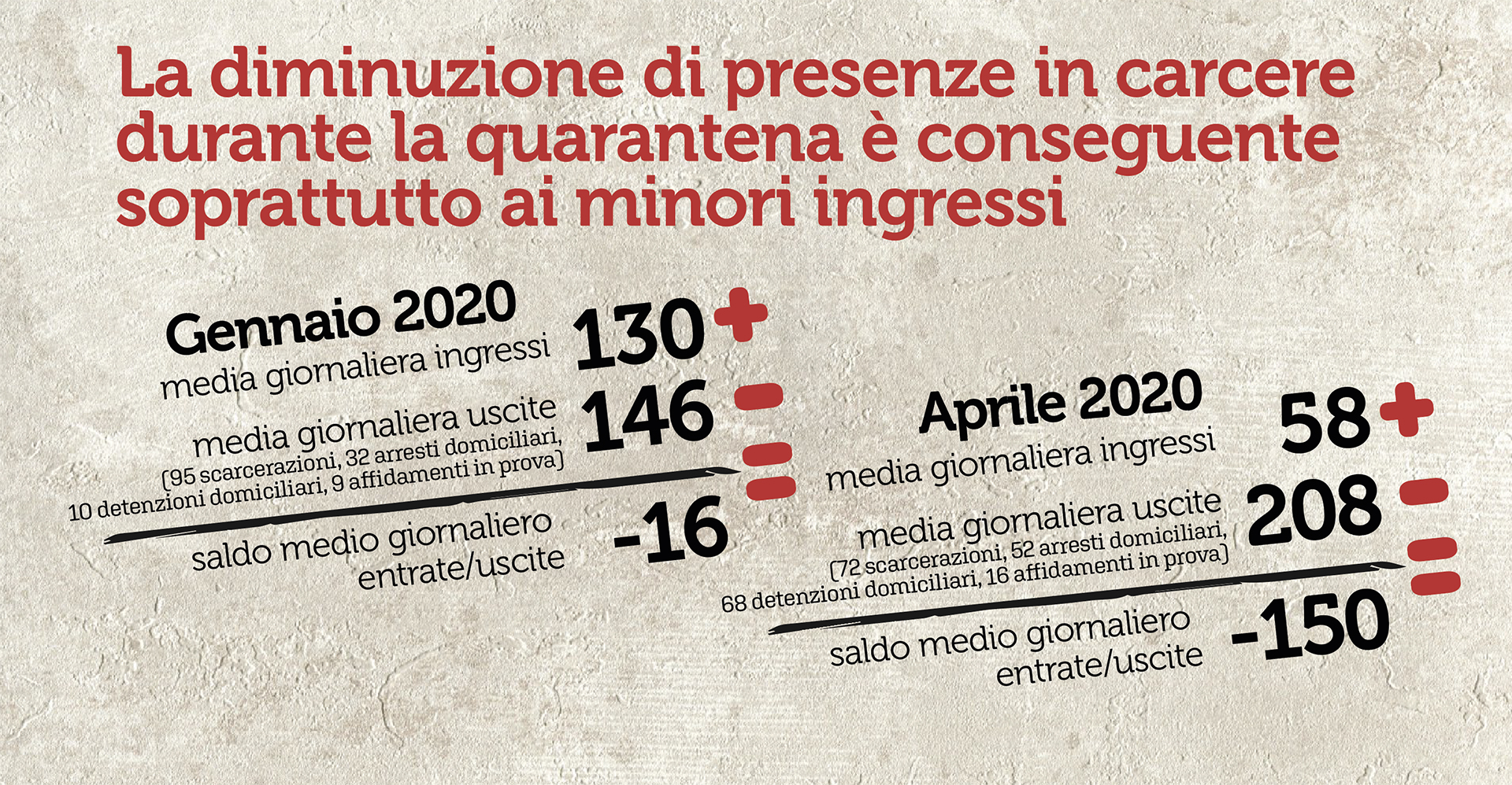 Conclusione. Il dato ottenuto da lavialibera l’8 giugno 2020 dal Dipartimento di amministrazione penitenziaria conta 223 scarcerazioni dai reparti di alta sicurezza per cause espressamente legate a covid, di cui 121 definitivi e 102 cautelari. Solo 4 domiciliari dal regime duro del 41 bis. Nel complesso, dal 19 marzo al 5 giugno 2020, le presenze in carcere diminuiscono di 6.899 unità, soprattutto a causa dei minori ingressi. A gennaio 2020, prima di covid, in carcere entravano ogni giorno mediamente 130 persone e ne uscivano 146; ad aprile 2020, in piena pandemia, ne entravano 58 e ne uscivano 208. In compenso, nello stesso periodo, si contano 13 morti non ancora chiarite e 21 suicidi, due dei quali hanno riguardato persone appena incarcerate e collocate in isolamento sanitario precauzionale. Nessuna scriteriata scarcerazione di massa dunque. Anzi, nonostante le quasi 7mila presenze in meno in carcere, gli istituti sono ancora sovraffollati, privi di strutture sanitarie adeguate, zeppi di persone in attesa di primo giudizio, malati, tossicodipendenti e senza dimora. Ma la propaganda trascura questi problemi strutturali: di loro nessuna traccia né in tv né sulle prime pagine dei giornali.