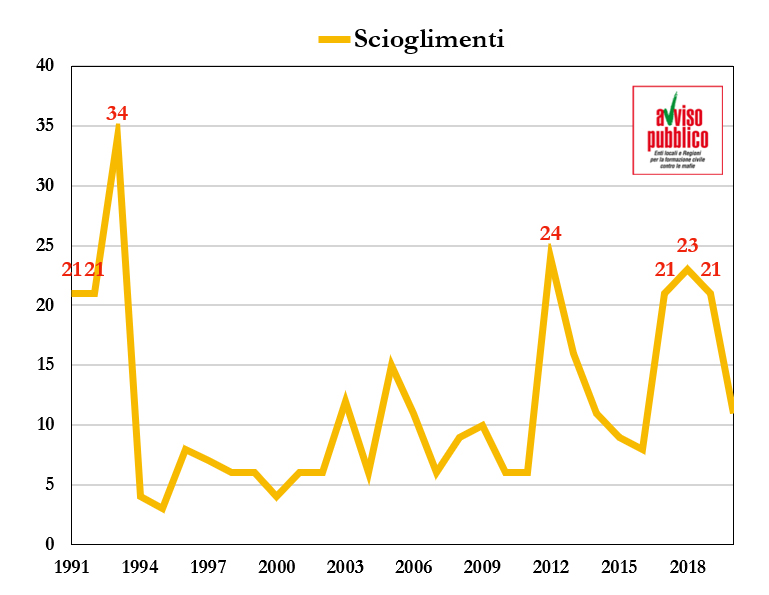 Sono stati 351 i provvedimenti dissolutori adottati nel corso di quasi trent’anni di applicazione della normativa, alla media di uno ogni 31 giorni. Nel solo 2020 sono stati undici gli scioglimenti disposti con decreto del presidente della Repubblica, su proposta del ministro dell’Interno, previa deliberazione del Consiglio dei ministri, al termine di un complesso procedimento di accertamento, effettuato dal prefetto competente per territorio, attraverso un’apposita commissione di indagine (detta commissione d’accesso).