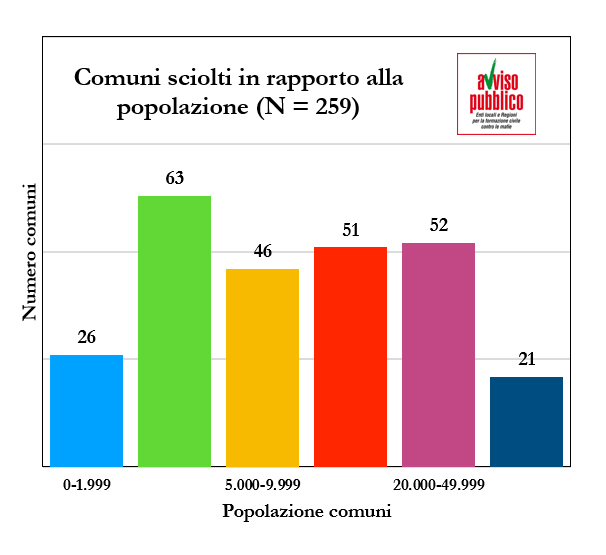 I 351 scioglimenti non corrispondono ad altrettanti enti locali. Infatti, ben 68 amministrazioni hanno subito più di un provvedimento: cinquanta comuni sono stati sciolti in due occasioni, altri diciotto addirittura tre volte: quindi gli enti locali sciolti per mafia almeno una volta dal 1991 ad oggi sono stati 265, tra cui un capoluogo di provincia – Reggio Calabria nel 2012 – e sei aziende sanitarie e ospedaliere. In questi territori vivono circa cinque milioni di persone, l’8% della popolazione residente in Italia.