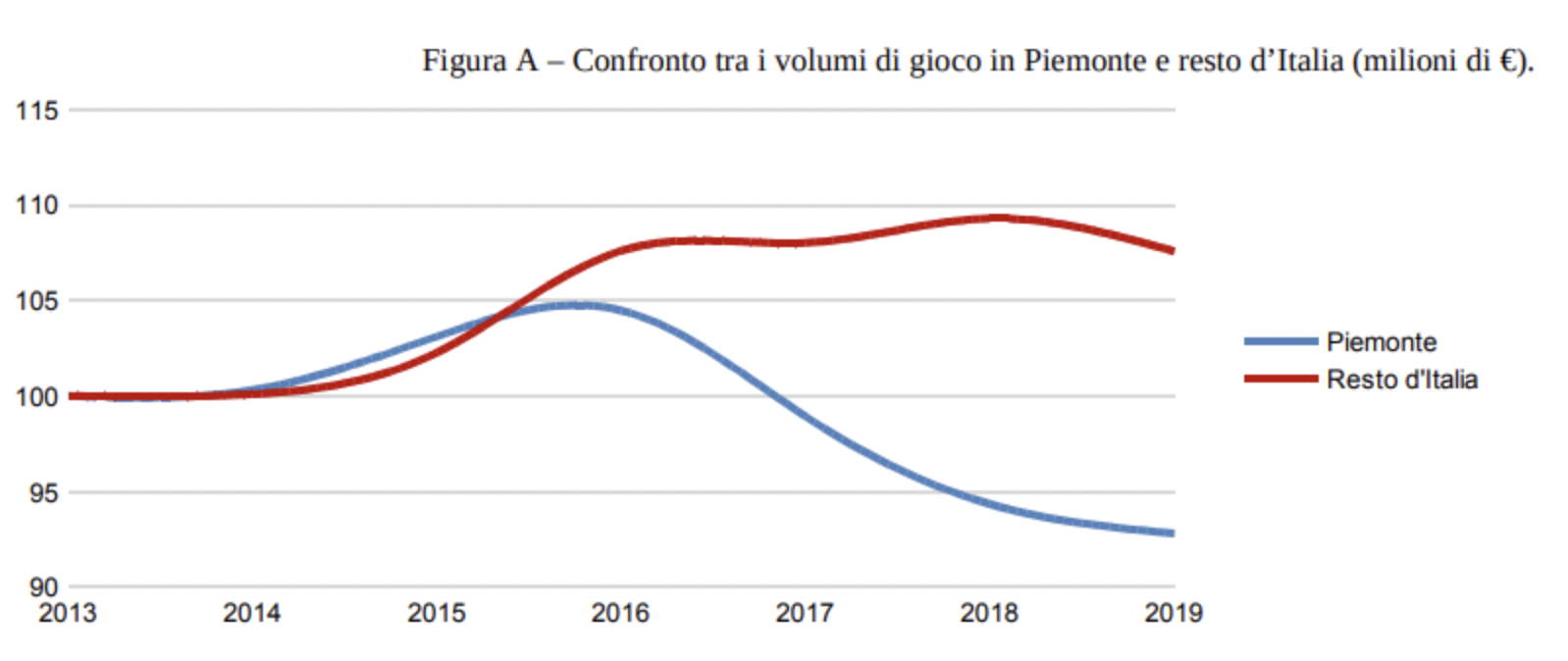 Secondo la relazione la crescita dei volumi dei giochi d’azzardo online nel periodo preso in considerazione ha registrato un andamento pressoché identico sia nel resto d’Italia (+72%), sia in Piemonte (+70%). “Per questo motivo è ragionevole sostenere che la gran parte dell’aumento che ha riguardato il Piemonte, se non la totalità, si sarebbe verificata anche in assenza dell’intervento del legislatore”. Non vi è stata pertanto una migrazione dei giocatori dal fisico all’online per effetto della legge 9/2016.