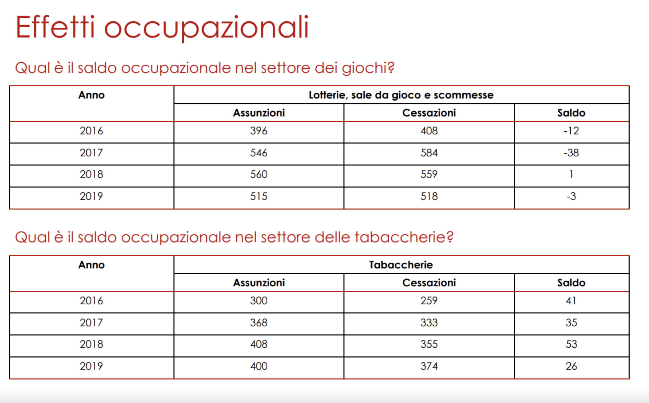 I dati dell’Osservatorio regionale sul mercato del lavoro del Piemonte mostrano l’andamento delle assunzioni e delle cessazioni dell’occupazione dipendente nei settori di riferimento. Come è possibile vedere nella figura, per quanto riguarda le tabaccherie il dato è abbastanza stabile e nei quattro anni il saldo complessivo è positivo. Invece, sul versante sale da gioco, nei quattro anni si registra un saldo leggermente negativo, ma in linea con il resto del mercato del lavoro.
