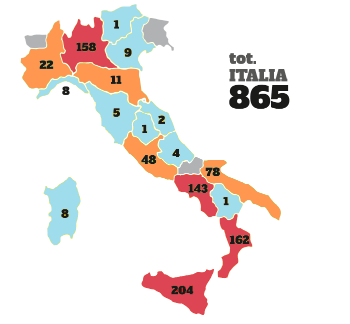 Se si guarda, invece, alle esperienze di riutilizzo il totale nazionale è di 865 perché può succedere che più soggetti gestiscano assieme uno stesso bene. Esperienze di riutilizzo sociale sono presenti in quasi tutte le regioni. Rimangono escluse solo Valle d’Aosta, Friuli-Venezia Giulia e Molise. Al primo posto svetta la Sicilia con 204 esperienze. Il terzo posto, dopo la Calabria (162) e prima della Campania (143), è per la Lombardia con 158 esperienze mappate.