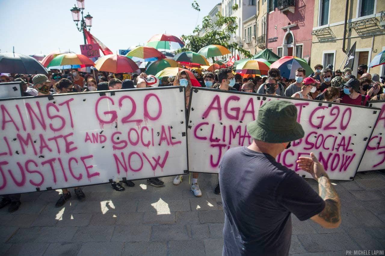 La rete "We are the tide, you are only G20" ("noi siamo la marea, voi solo il G20") – nata un mese fa e decisa a proseguire in vista della Cop26 di Glasgow – ha presidiato Venezia durante tutti i giorni del summit. Dopo svariate dimostrazioni pacifiche e colorate, alla fine gli scontri.