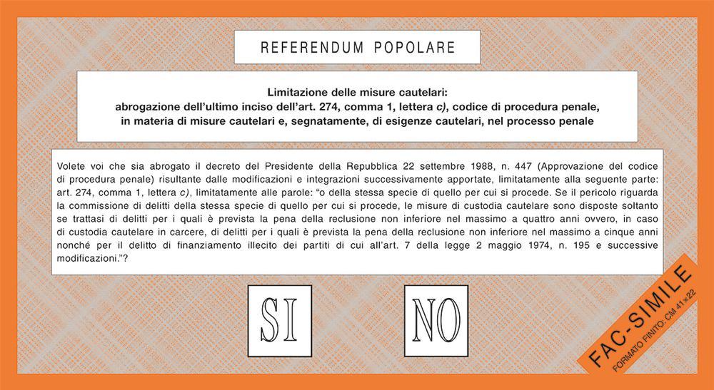 Volete voi che sia abrogato il Decreto del Presidente della Repubblica 22 settembre 1988, n. 447 (Approvazione del codice di procedura penale), risultante dalle modificazioni e integrazioni successivamente apportate, limitatamente alla seguente parte: articolo 274, comma 1, lettera c), limitatamente alle parole: “o della stessa specie di quello per cui si procede. Se il pericolo riguarda la commissione di delitti della stessa specie di quello per cui si procede, le misure di custodia cautelare sono disposte soltanto se trattasi di delitti per i quali è prevista la pena della reclusione non inferiore nel massimo a quattro anni ovvero, in caso di custodia cautelare in carcere, di delitti per i quali è prevista la pena della reclusione non inferiore nel massimo a cinque anni nonché’ per il delitto di finanziamento illecito dei partiti di cui all’articolo 7 della legge 2 maggio 1974, n. 195 e successive modificazioni.”?