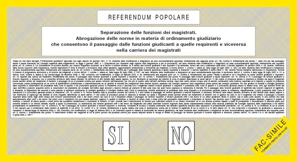 Il lunghissimo quesito della scheda gialla (quasi settemila caratteri) mira alla separazione tra la carriera tra i magistrati requirenti, i pubblici ministeri che coordinano le indagini e rappresentano l’accusa in aula, e i magistrati giudicanti. Si tratta di un provvedimento in discussione da anni, cavallo di battaglia dei provvedimenti in tema di giustizia anche di Silvio Berlusconi.