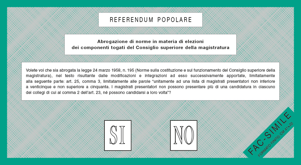 Volete voi che sia abrogata la Legge 24 marzo 1958, n. 195 (Norme sulla costituzione e sul funzionamento del Consiglio superiore della Magistratura), nel testo risultante dalle modificazioni e integrazioni ad esso successivamente apportate, limitatamente alla seguente parte: articolo 25, comma 3, limitatamente alle parole “unitamente ad una lista di magistrati presentatori non inferiore a venticinque e non superiore a cinquanta. I magistrati presentatori non possono presentare più di una candidatura in ciascuno dei collegi di cui al comma 2 dell’articolo 23, né possono candidarsi a loro volta”?